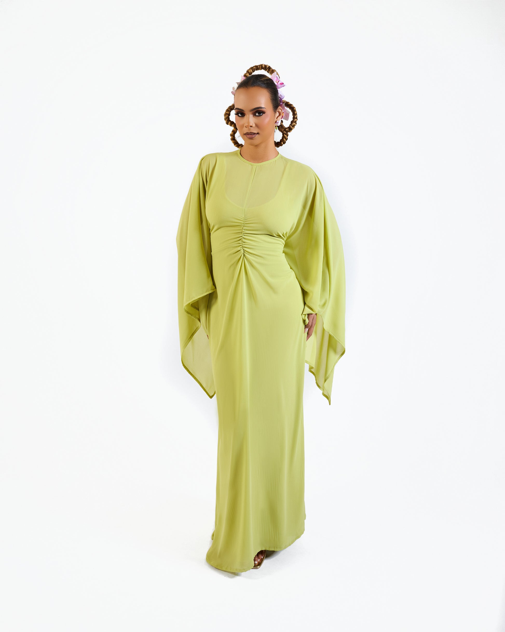 The Orielle Dress offers a fresh, modern take on effortless elegance. Crafted from soft chartreuse chiffon, this full-length design features a flowing open-back cape that creates beautiful movement and subtle drama, perfect for both daytime occasions and evening events.