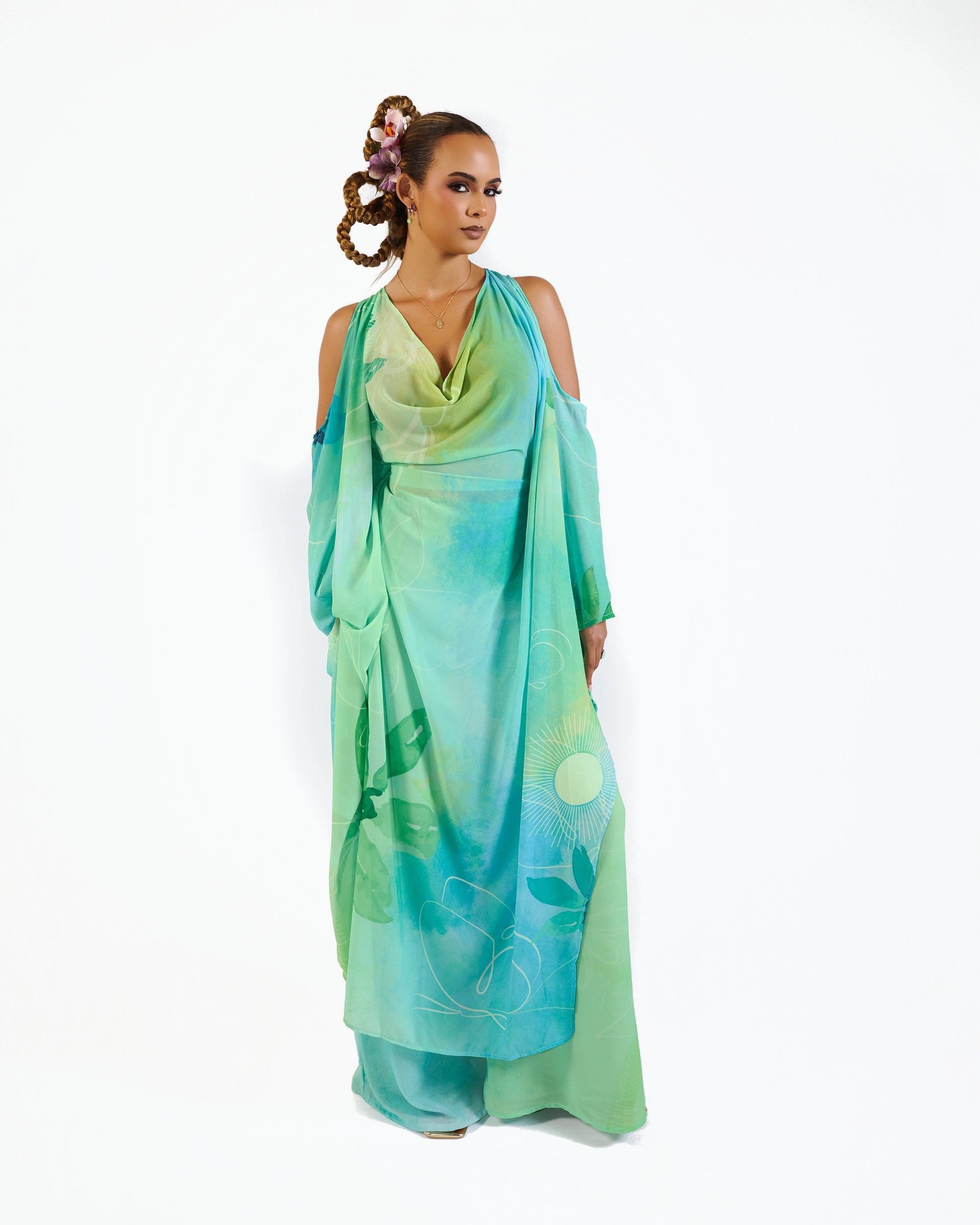 The Rhea Set features a flowing boubou paired with flare trousers, both adorned with our exclusive Malia print on soft pearl chiffon. The boubou’s cowl neckline and inner waist belt provide shape and structure, while the fully lined full-length trousers ensure comfort and ease of movement.